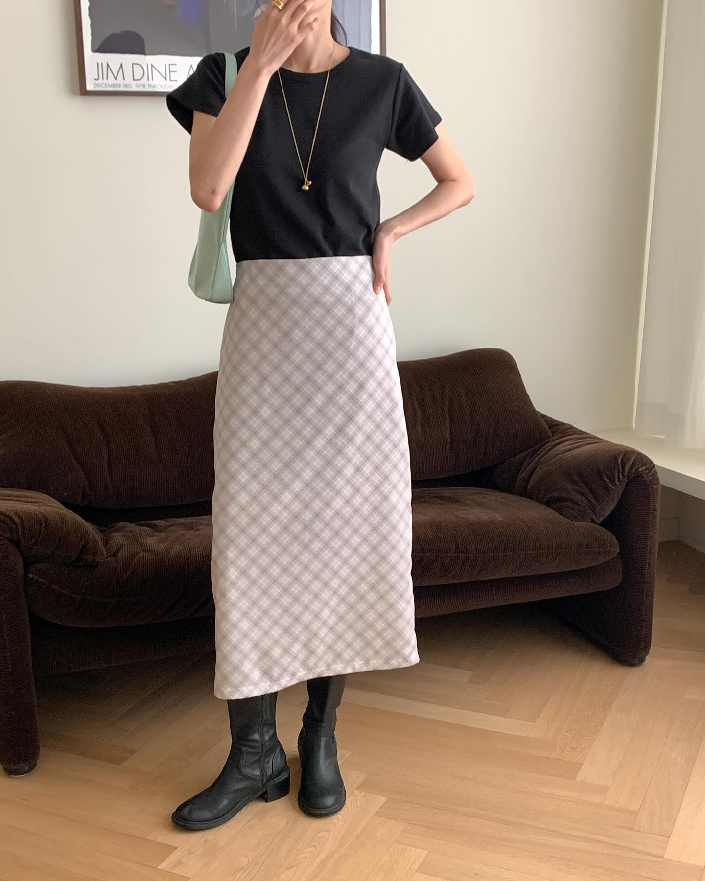 Chân váy suông kẻ ô toát lên sự ngọt ngào, trẻ trung nhưng vẫn phảng phất nét cổ điển, thanh lịch. Combo chân váy kẻ và áo thun đen tạo nên bộ trang phục trẻ trung, hiện đại. Những món đồ như dây chuyền, túi xách xanh pastel, boots cao cổ tạo điểm nhấn nổi bật của outfit.